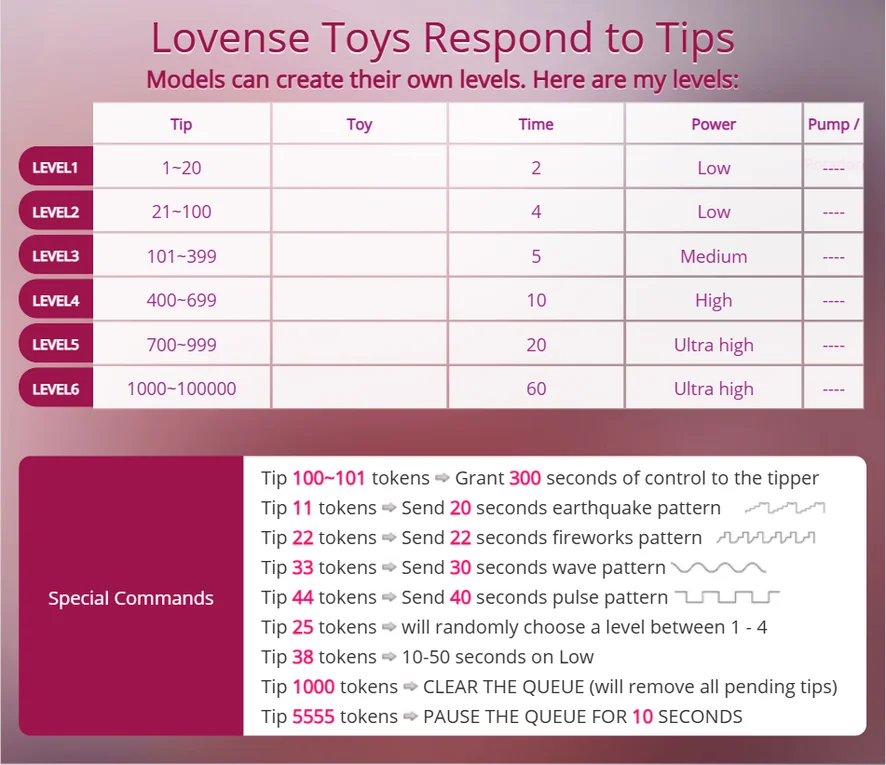 Kys, Sexlegetøj, Brystvortelegetøj, Dirty talk, Cowgirl, Creampie, Dildo eller vibrator, Ejakulation, Fodfetich, Finger, Brystsex, Onani, Orgasme, Spanking, Olieshow, Penisring, Brusebad, Cuckold, Madlavning, Erotisk dans, Massage, Facesitting, Swingere, Topløs, Twerk, CEI, Bedømmelse af pik, Rygning, Onaniinstruktion, Rollespil, SPH, Kameltå, Ydmygelse